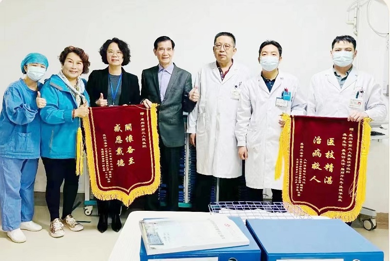 陈超越(左四)出院后给医护人员送来致谢的锦旗