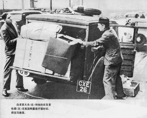 白求恩(右)和战友在英国购置医疗器材后,前往马德里