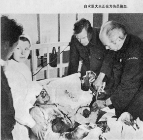 白求恩大夫正在为伤员输血