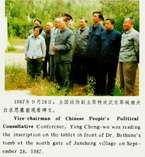 1987年9月28日,全国政协副主席杨成武在军城南关的白求恩墓前观看碑文。 |
