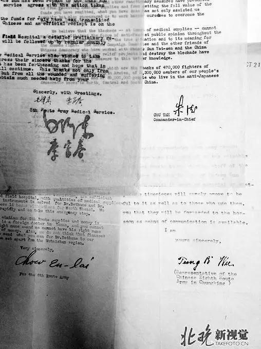 为什么这些珍贵书信和中共党史第一手原始资料会来到远隔万水千山的美国?几个月来,通过大量原始资料的阅读、信息搜寻和查证文献,作者努力还原历史,试图从错综复杂的史实中爬梳脉络、去芜存菁;结合大部分当事人的背景资料从纵横两个坐标切入事件和背景,算是基本还原了中国革命史上的一段秘辛。 毛泽东、周恩来、李富春的信 首先来看看周恩来的信。 朋友们: 如我们几星期前写信所告知,诺尔曼·白求恩医生给我们发来了无线电报,他和另一位志愿为我军做医务工作的外国医生理查德·布朗先生已经抵达那个地区……白求恩医生请求贵处能汇给他们一千美元为那个地区的医疗和手术器械所用。他请求将这笔款项寄到延安的马医生那儿。 我们多么希望能向贵处报告你处通知我们的那14箱医疗手术器材已经来到了延安并被输送到了五台山地区…… 至于上面提到的一千美元,八路军的设备和资金接收处是香港的保卫中国同盟…… 您的真诚的, 周恩来、八路军代表 此信写于1938年8月4日,从八路军汉口办事处寄出。收信人是“美国援华委员会、美国和平民主同盟(前身是美国反战和反法西斯同盟)”。