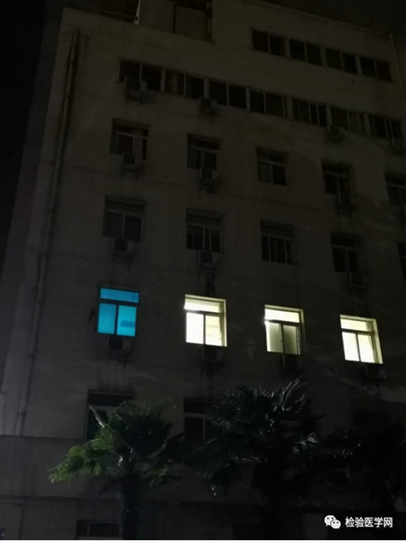 图6:深夜凌晨仍在加班的实验室(蓝色为紫外灯消毒) 为了更好地工作,也为了家人安全,党支部书记程方雄以身示范,以院为家,带领杜治国、叶俊、邹琴、张忠佩等十名同志自行与家人隔离,随时保持“战斗”状态。虽然检验战士们不直接接触患者,却在幕后与病毒近距离接触搏斗,不仅要对感染者或疑似感染者的样本进行各种检验分析,在现有条件和保证质量的前提下,尽可能地加班加点到深夜加大病毒核酸检测的数量,还要对检验样本及检测过程中产生的高危高风险废物进行高压灭菌等善后处理,面临着同样甚至更大的危险。只为了能让更多的感染者得到早日确诊住进医院并调整治疗方案,为治好的病人带来连续核酸检测为阴性即可以出院出舱的佳音。