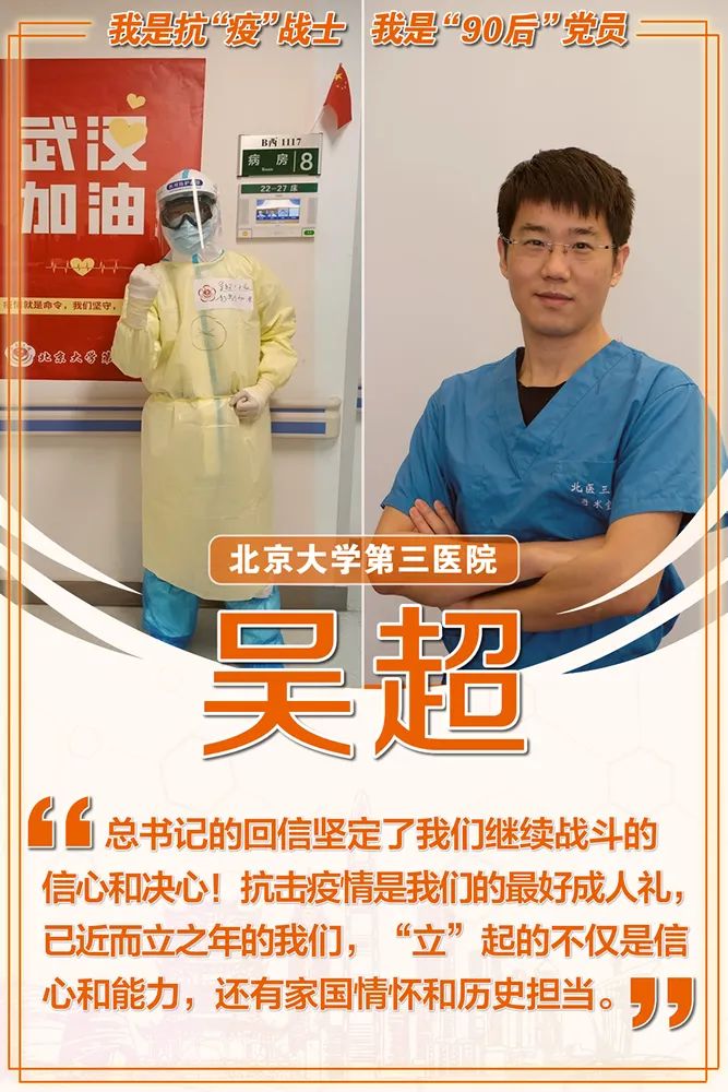 本站讯(北大医学部3月20日报道)3月11日,北大医学援鄂医疗队的王奔和吴超代表医疗队34位“90后”党员向总书记写信,汇报前线“90后”的工作和青春风采,表达了“90后”不怕吃苦、不怕牺牲的坚定信心。 3月15日,习近平总书记回信,充分肯定青年人在抗“疫”斗争中的突出贡献,赞扬他们不畏艰险、冲锋在前、舍生忘死,彰显了青春的蓬勃力量、交出了合格答卷。全体北大医学人倍感振奋,奋战前线的白衣天使尤其是“90”后们深受鼓舞,阻击疫情的决心更加坚定,战胜病毒的斗志更加昂扬。