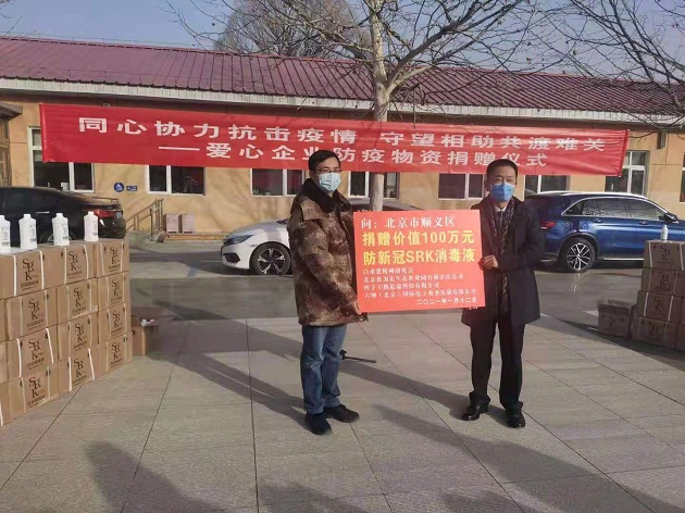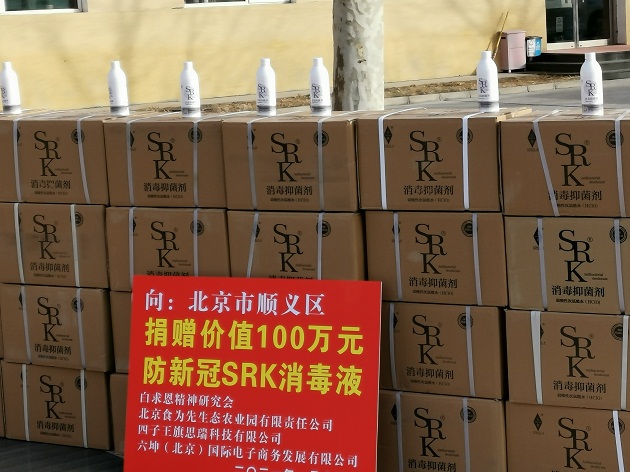 本会讯 1月12日上午,正值天寒地冻,北京顺义区疫情吃紧之际,中国白求恩精神研究会联合北京食为先生态农业园有限责任公司、内蒙古四子王旗思瑞科技有限公司和六坤(北京)国际电子商务发展有限公司等爱心企业,在北京市顺义区北石槽镇举行抗击新型冠状病毒肺炎疫情捐赠仪式。三家爱心企业共同捐赠价值100万元的SRK食品级消毒抑菌剂,为疫情抗战一线贡献出企业力量。
