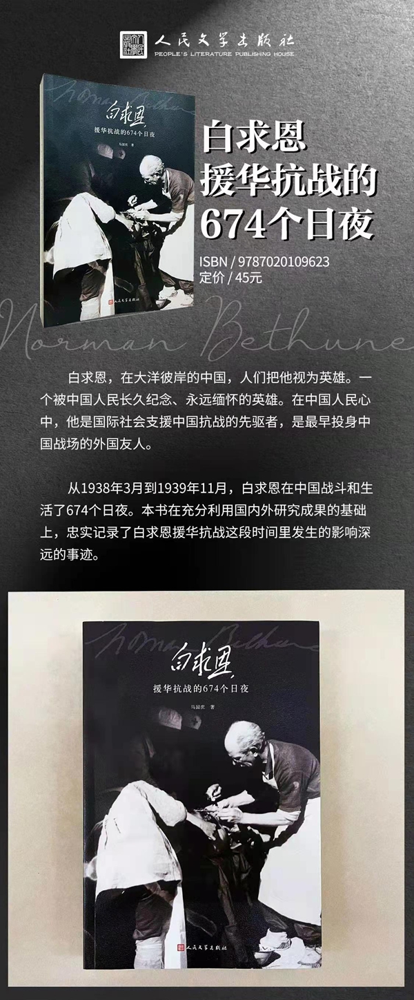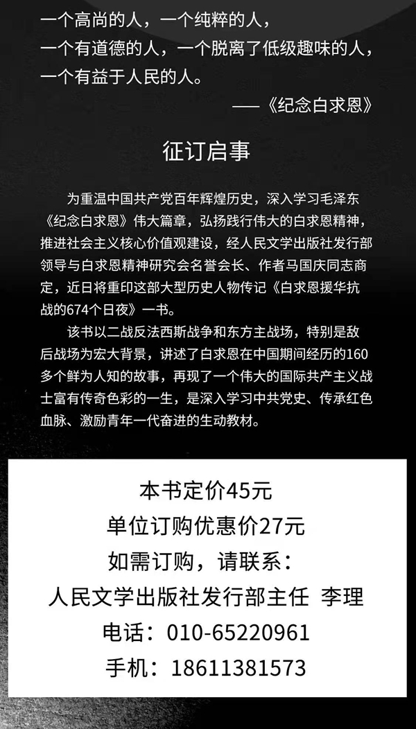 征 订 启 事 (白研发字〔2021〕58号) 各会员单位、各分支机构: 为重温中国共产党百年辉煌历史,深入学习毛泽东《纪念白求恩》伟大篇章,弘扬践行伟大的白求恩精神,推进社会主义核心价值观建设,经人民文学出版社发行部与白求恩精神研究会名誉会长、作者马国庆同志商定,近日将重印大型历史人物传记《白求恩援华抗战的674个日夜》一书。 该书以二战反法西斯战争和东方主战场,特别是敌后战场为宏大背景,讲述了白求恩在中国期间经历的160多个鲜为人知的故事,再现了一个伟大的国际共产主义战士富有传奇色彩的一生,是深入学习中共党史、传承红色血脉、激励青年一代奋进的生动教材。本书订价45元,单位订购优惠价27元。 联系人:人民文学出版社发行部主任 李理 电话:010-65220961/18611381573 白求恩精神研究会 二〇二一年六月十一日