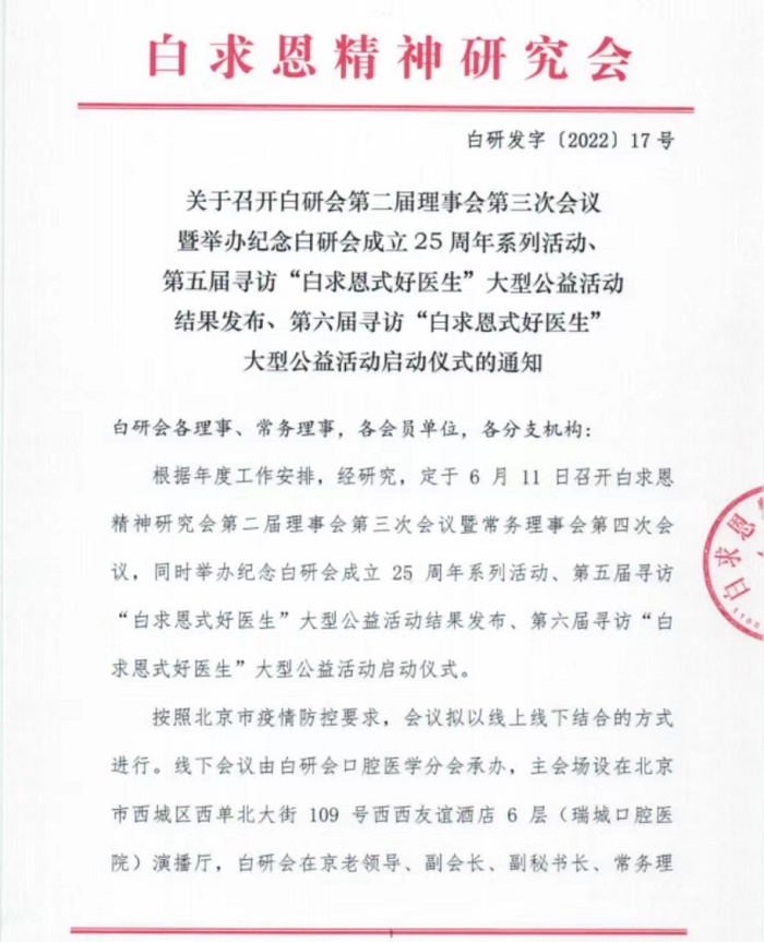 | 关于召开白研会第二届理事会第三次会议 暨举办纪念白研会成立25周年系列活动、 第五届寻访“白求恩式好医生”大型公益活动 结果发布、第六届寻访“白求恩式好医生” 大型公益活动启动仪式的通知 | |||||