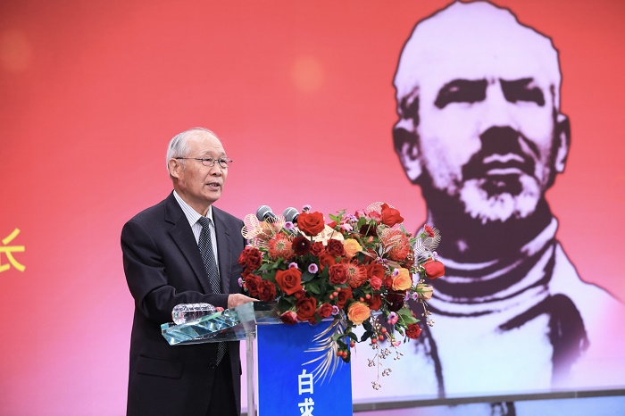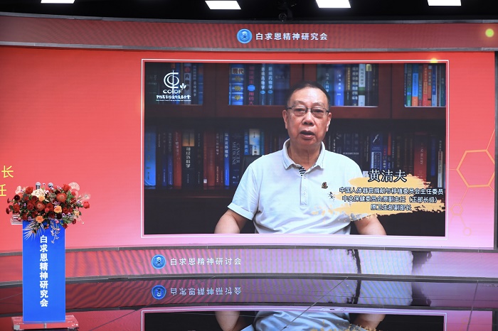 他在讲话指出,白求恩精神研究会自成立以来,走过了 25 年的不凡历程,创造了许多不凡的业绩。特别指出的是党的十八大以来,始终坚持以习近平新时代中国特色社会主义思想为指导,以传承党的红色基因、弘扬白求恩精神为主线,以倡扬新发展理念、模范践行社会主义核心价值观为己任,研究会建设呈现出稳步发展,不断向上的可喜形势。新时代新发展阶段赋予了白求恩精神以新的思想内涵、价值追求和鲜明特征,希望白求恩精神研究会发挥好国家级学会宣传阵地、组织阵地的优势作用,大力弘扬伟大民族精神、时代精神、伟大建党精神和“敬佑生命、救死扶伤、甘于奉献、大爱无疆”的医疗职业精神,让白求恩精神更加深入人心,不断为增进人民健康福祉做出新贡献,为健康中国战略谱写新篇章,为构建人类命运共同体和卫生健康共同体再铸新辉煌!
