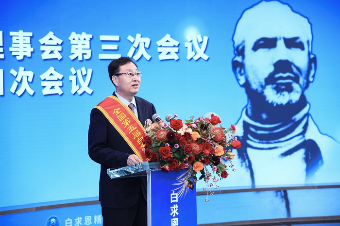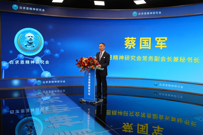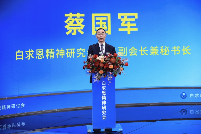 蔡国军指出,2021年,是我国“十四五”发展规划的开局之年,是中国共产党建党100周年,同时,也是白求恩精神研究会换届选举后,顺利实现新老交替,各项工作守正创新的开篇之年。一年来,白研会积极适应新形势、把握新机遇、探索新路子、创建新机制,在新一届理事会的团结带领下,通过上下共同努力,较好开创了各项工作的新局面。具体体现在以下六个方面。 一是党建引领更加凸显。自觉把党建工作放在首要位置,在组织开展党史学习教育、贯彻党的十九届六中全会精神等活动中,始终走在前列。二是纪念活动更加丰富。以建党100周年为契机,组织开展了重走红色之旅、重读红色经典、观看红色影片、讲述红色故事以及“党员话党史、医心话初心”“学党史、守初心、送健康”等专题实践活动。三是研讨交流更加多元。充分发挥白研会在医学人文、思想研究和民间外交领域的优势,先后发起了多场线上线下高峰论坛、对话会、纪念会和学术研讨会。四是自身建设更加规范。坚决贯彻落实民政部等22部门联合印发的通知要求,对12份内部规章制度进行了认真梳理和修改完善,下发了《关于进一步加强分支机构规范管理的通知》等,各项工作依法合规、健康有序运行。五是公益行动更加高效。始终坚持公益强会的初心不变,自觉服从服务于国家工作大局,在疫情防控、医疗扶贫、慈善关爱、帮扶基层和振兴乡村建设等方面,有序组织,积极参与,主动作为。六是社会影响更加广泛。持续开展第五届“白求恩式好医生” 寻访宣传大型公益活动,与时俱进宣传白求恩事迹,讲好白求恩故事,传播白求恩精神,有效提升了白研会的社会知名度和影响力。