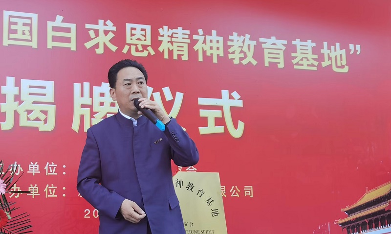 魏建国宣读批复 首先,白求恩精神研究会副秘书长魏建国宣读了关于批准新疆亿创科技发展有限公司白求恩纪念馆为“全国白求恩精神教育基地”的批复。 然后,白求恩精神研究会名誉会长栗龙池、新疆亿创科技发展有限公司代表艾尼瓦尔.买买提、野马集团有限公司董事长陈志峰、特型演员周恩来扮演者周红军、乌鲁木齐医师协会名誉会长杨芳纯等为“全国白求恩教育基地“揭牌。