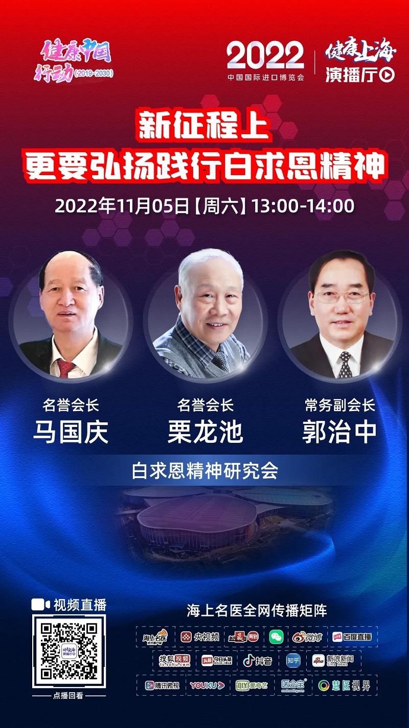应广大受众要求,下面转发白求恩精神研究会栗龙池、马国庆、郭治中三位嘉宾做客进博会“健康上海演播厅”,接受访谈的文字实录。 采访主题:新征程上更要弘扬践行白求恩精神 主 持 人:大家好,欢迎进入到2022年中国国际进口博览会健康上海演播厅的直播,我是主持人楚妍,这个时段我们也非常荣幸的邀请到了三位嘉宾,共话《新征程上更要弘扬践行白求恩精神》。下面首先为大家介绍到场的三位嘉宾,他们是:白求恩精神研究会名誉会长 栗龙池,白求恩精神研究会名誉会长 马国庆,白求恩精神研究会常务副会长 郭治中。 欢迎各位的到来!中国共产党第二十次全国代表大会刚在北京胜利闭幕,今天第五届中国国际进口博览会隆重开幕,两大盛事交相辉映,我相信这也将给我们今天的对话带来不一样的收获。接下来我们要与嘉宾聊一聊,为什么在“新征程上更要弘扬践行白求恩精神”。 2016年以来,习近平主席提出健康中国战略,指导制定了健康中国战略实施《纲要》,并对医疗卫生工作做出了一系列重要讲话和重要批示,形成了系统完备的习近平卫生思想。 首先,我想请栗会长给大家介绍一下,白求恩精神研究会在推进健康中国战略落地中都开展了哪些卓有成效的工作?