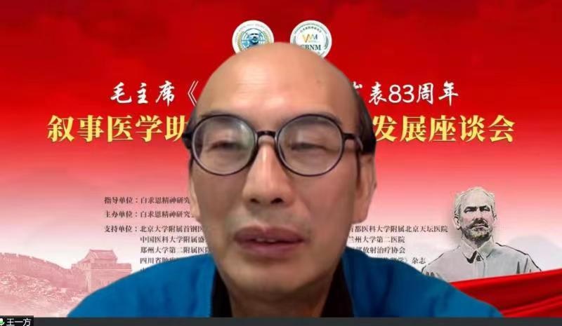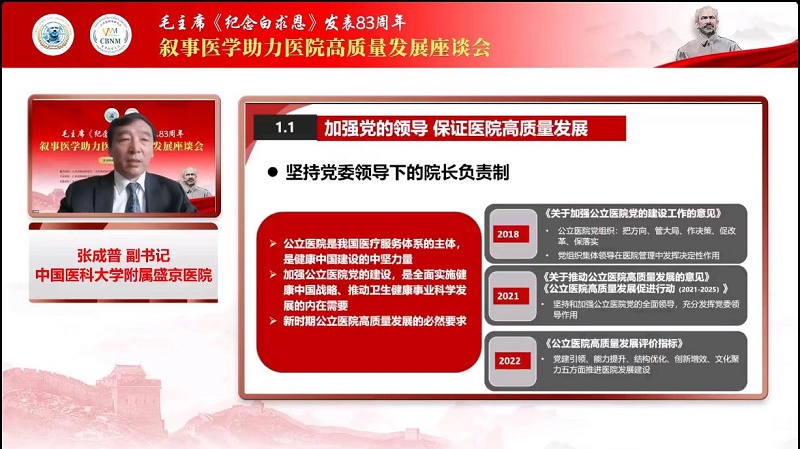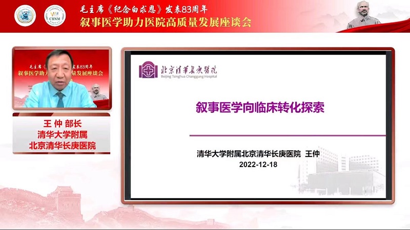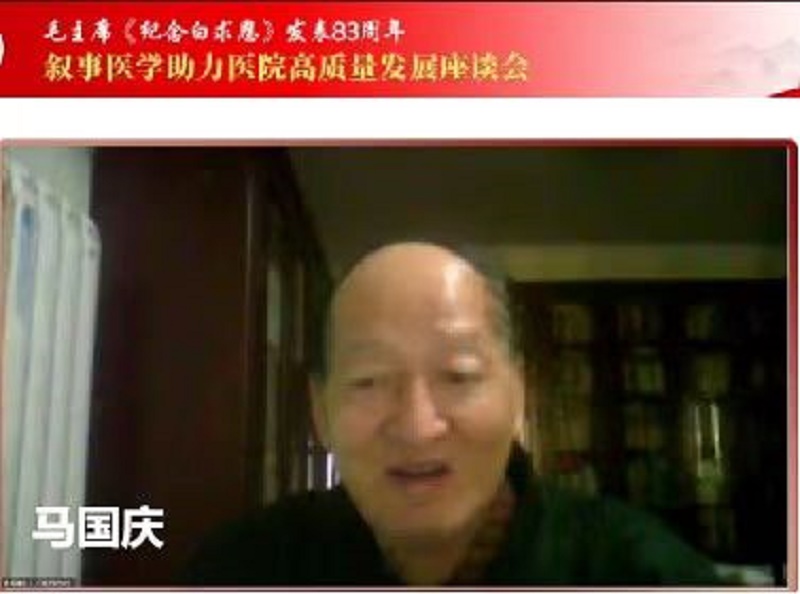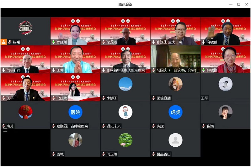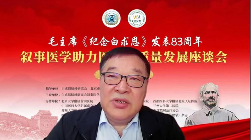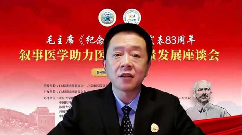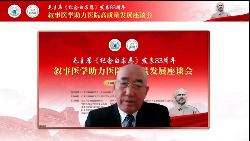 本会讯 12月18日上午,恰逢毛主席《纪念白求恩》一文发表83周年之际,由白求恩精神研究会、北京市医院管理中心指导,白求恩精神研究会叙事医学分会(筹委会)具体承办的“毛主席《纪念白求恩》发表83周年暨叙事医学助力医院高质量发展座谈会”在线上举行。白求恩精神研究领域的知名专家与医疗卫生系统的领导学者相聚云端,重温白求恩事迹、感悟白求恩精神,高举白求恩旗帜,共商叙事医学助力医院高质量发展的美好蓝图。