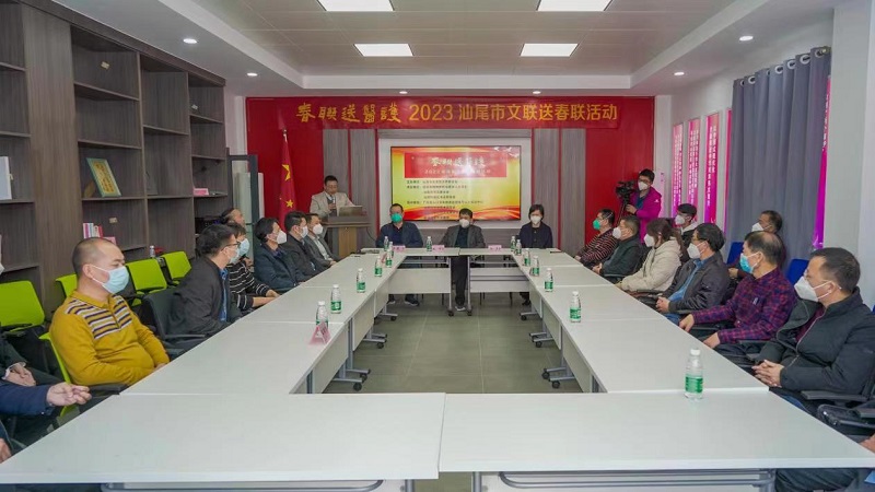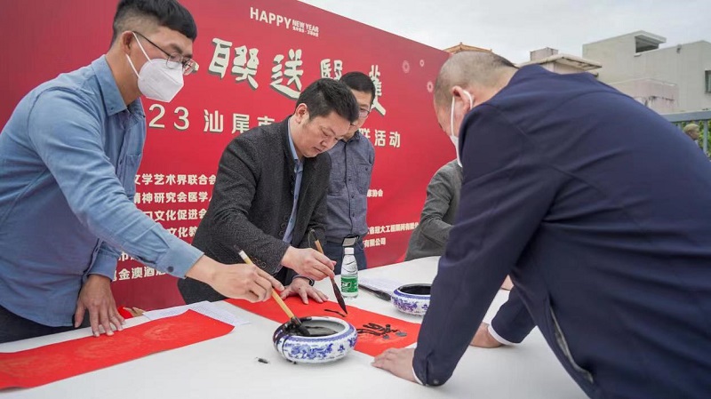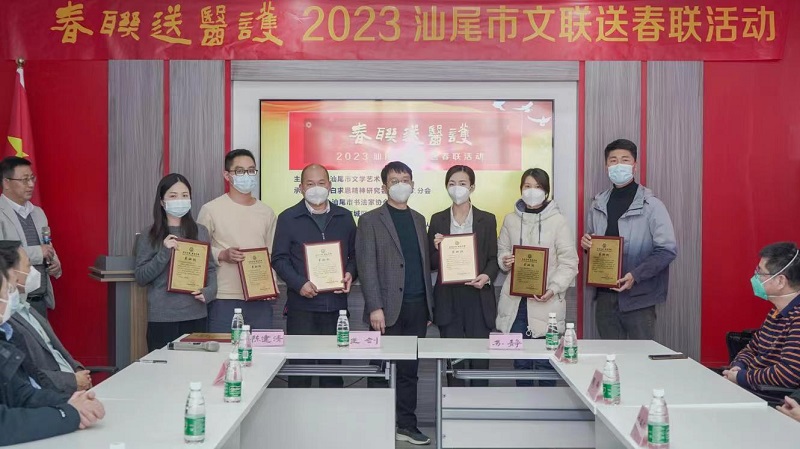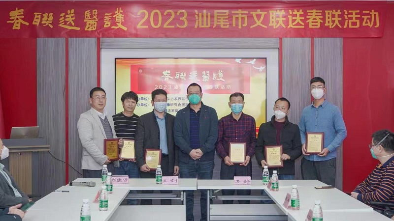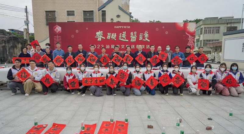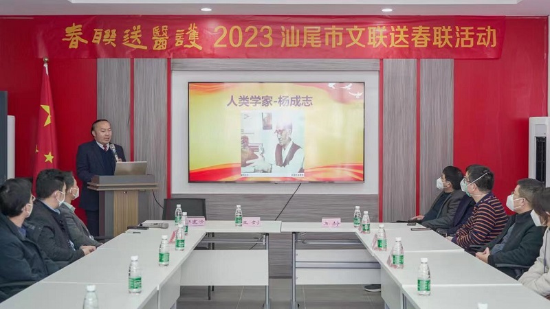 本会讯 2023年1月8日,白求恩精神研究会医学人文分会联合汕尾市文学艺术界联合会、汕尾市书法家协会、汕尾市城区书法家协会等单位,在赤岗人文研学基地(杨成志生平展馆)举办“春联送医护”活动,旨在弘扬白求恩精神,感恩医护人员在疫情期间的无私奉献。市文联党组书记、主席王剑,市文联四级调研员苏静,市文联办公室主任陈建清,医护界代表、汕尾市中心血站及支持本次活动的企业代表和书法家、城区给力义工协会等40多人参与了活动。